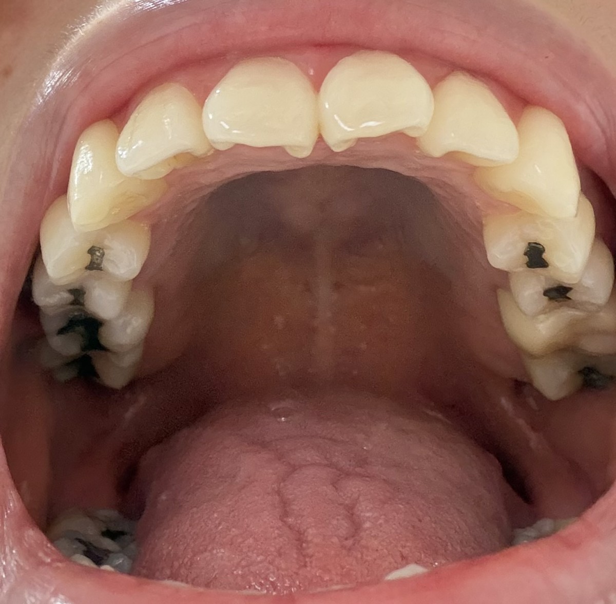 현재 앞니가 약간 앞으로 돌출되어 있고, 끝 부분이 살짝 벌어진 상태입니다.